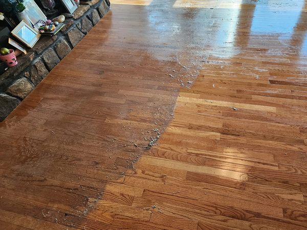 If an acrylic polish is detected, we will apply a product to emulsify the acrylic polish. We agitate the floor using a low-speed buffer and an abrasive scrubbing pad. The residue is then extracted from the wood floor using a floor scrubber and another product to neutralize the floors.