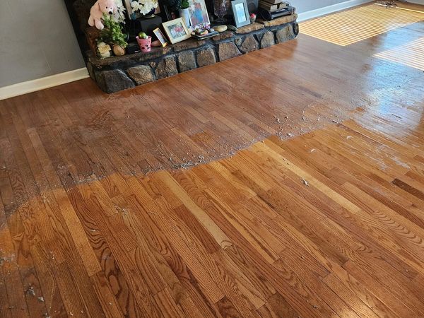We start by testing the hardwood to determine if they have a top layer of acrylic polish. Acrylic Floor Polish can cause appearance issues over time and must be removed prior to refinishing.